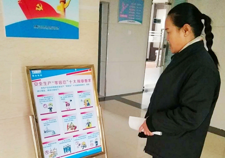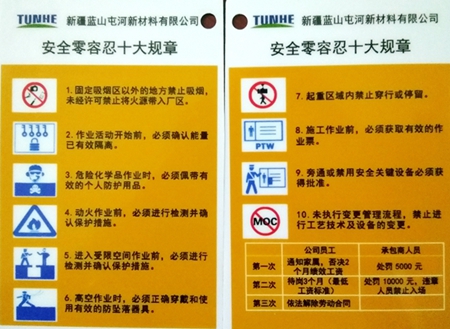 新材料事业部积极在人员集中进入厂区的大门口、二道门口、办公楼大厅通过摆放宣传展板、悬挂横幅标语等多种形式,向职工宣传“零容忍十大规章要求”的主要内容,提升职工安全意识。领导干部亲身以躬带头熟记“零容忍十大规章要求”,各部门、车间、班组也通过开展形式多样的宣传活动。如:以“零容忍”为主题的专题培训,手抄“零容忍”,每位基层员工和领导佩戴标识牌、解读“零容忍”等活动,将“零容忍”的理念、宗旨在工作实践过程中升华、扩散、渗透,为全体职工所认识、认知、认同、接受,转化为全体员工遵章守法、按章作业的自觉行动,使安全文化内化于心,外化于行。