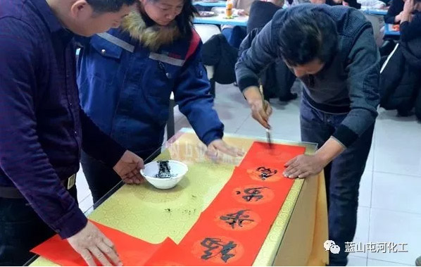 之后,“砥砺奋进 喜迎2019”联欢会活动在全体员工齐唱《我们由衷的感谢》中拉开序幕,歌曲唱出职工对公司、对同事的感恩和感谢。总经理蒋文君向全体员工祝福新年快乐。活动中穿插了游戏环节、抽奖环节和安全知识、阿米巴知识竞赛环节,提高了职工参与的积极性调动了活动气氛。游戏“摇摇乐”使活动达到了高潮,参与者们八仙过海各显神通,抽象的肢体动作让大家欢笑不断。吃饺子写对联送祝福,储运车间侯主任挥毫泼墨,一幅精美的对联潇洒俊逸、一气呵成。将中国传统民俗过大年写对联的喜庆气氛一一彰显。最后联欢会在大合唱《团结就是力量》的歌声中缓缓落下帷幕。现场的同事们纷纷拿出手机记录这精彩的一幕,为联欢会画上了圆满的句点。根据各部门全员参与率以及节目质量评选出了两名“最佳活动组织奖”,分别是节水业务部和喀什中天公司。