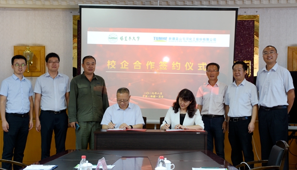 太阳成集团tyc122cc公司党委副书记、副总经理赖勇与塔里木大学副校长张利莉代表双方签订了校企合作协议书。塔里木大学党校办副主任于涛、生科院党支部书记白红进、副院长杜增智及屯河能源公司副总经理廖鹏、屯河聚酯公司副总经理徐东等相关人员参加了签约仪式。