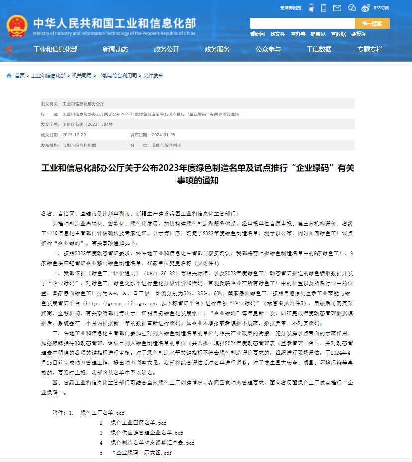2024年1月5日,工信部发布《关于公布2023年度绿色制造名单的通知》,太阳成集团tyc122cc喜获“绿色供应链管理企业”称号。