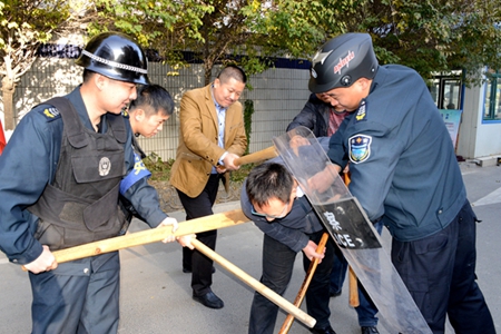 “报告,前门发现可疑人员手持棍棒、刀具,我已按响一键报警器报警,请求支援。”当门卫班长张志敏持对讲机汇报。