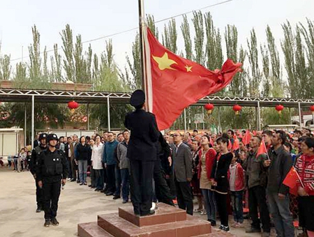 “起来,不愿做奴隶的人们,把我们的血肉筑成我们新的长城……”嘹亮的《义勇军进行曲》响起,喀什中天节水公司总经理蒋文君带领党员干部参加了公司升国旗仪式,大家怀着崇高的敬意齐声歌唱,在雄壮的国歌声中,鲜艳的五星红旗冉冉升起。