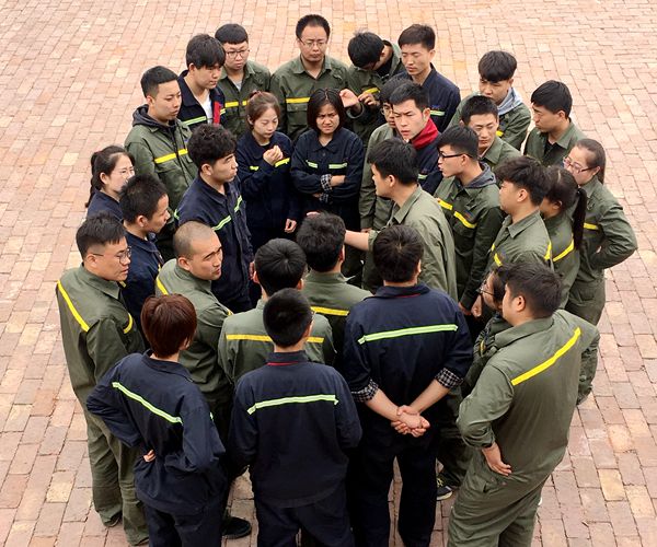 当天,经过一小时的车程,终于到达目的地——华兴拓展培训中心。在教练的指挥下,全员下车集合,整顿队形,“稍息,立正,站好!”停止间转法“向右转、向左转和向后转”,军人的飒爽英姿,严格作风,铁一般的纪律!热身结束后,为激发队员们的积极性,分为两队,通过各组队员共同设计自己的队名、口号、队形、队歌来建立团队荣誉感,展开激烈竞争。