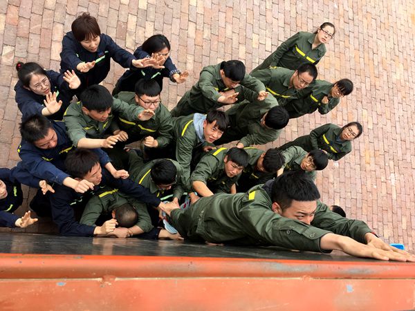 5米高的逃生墙,40名队员不准借助任何外力,期间不准有任何言语交流,在15分钟内全部通过。经历了前面项目的成功,队员们并没有感到畏惧,反而士气高涨。就在大家都觉得势在必得的时候,因为一些队员的犯规,导致挑战中止,队长因为失职而得到了相应的惩罚,队员们难以抑制心中的自责,红了眼睛,湿了眼眶。与此同时,一种决心,一种坚定,一种信念油然而生。大家吸取经验,重振旗鼓,咬着牙忍着痛开始了新一轮的攀登,在最后一名队员顺利登顶的那一刻,大家流着泪抱在了一起……