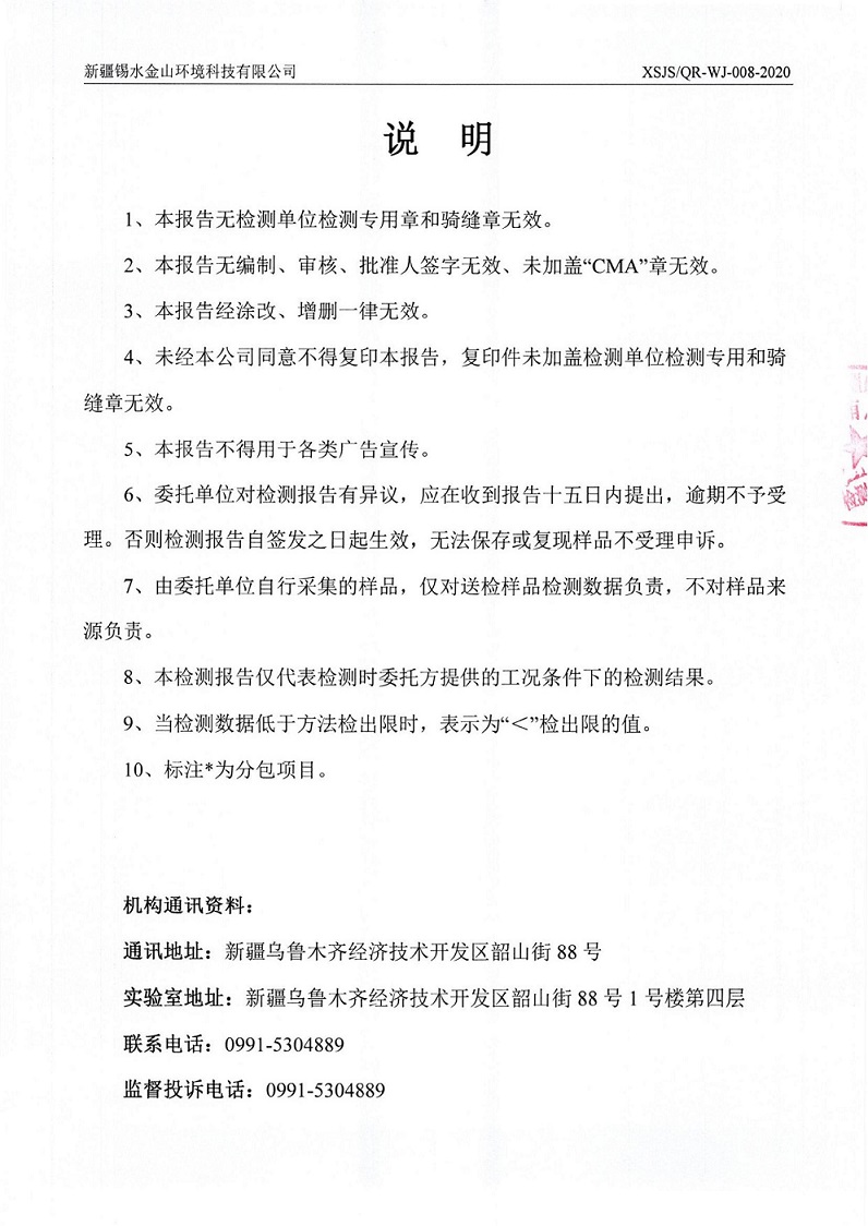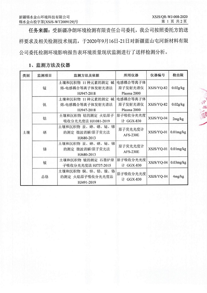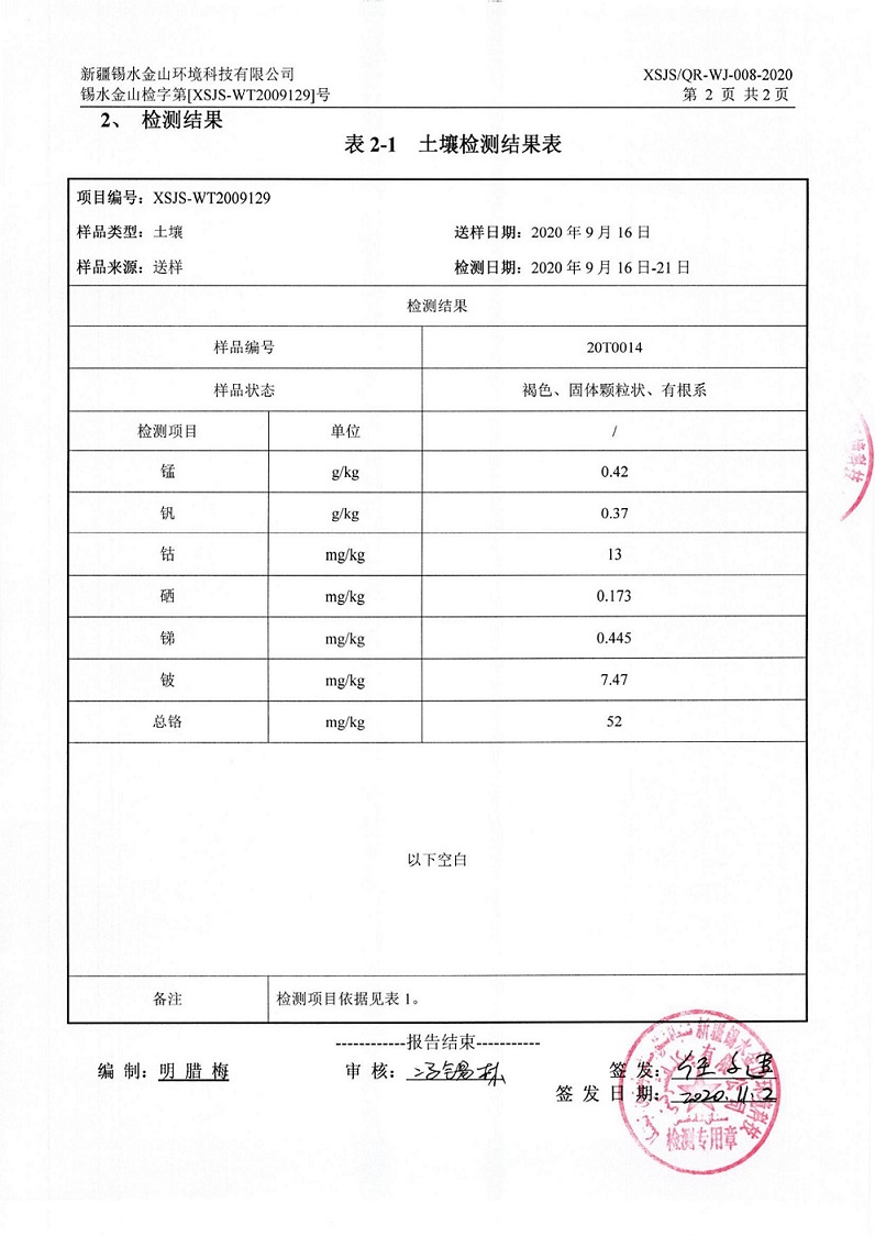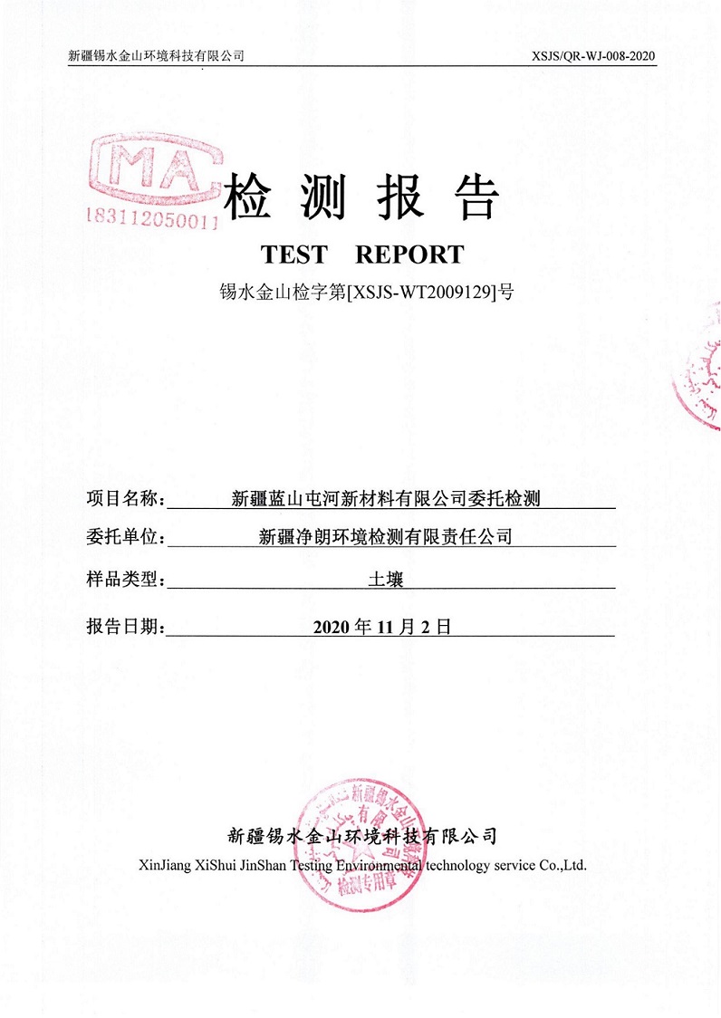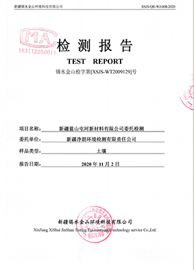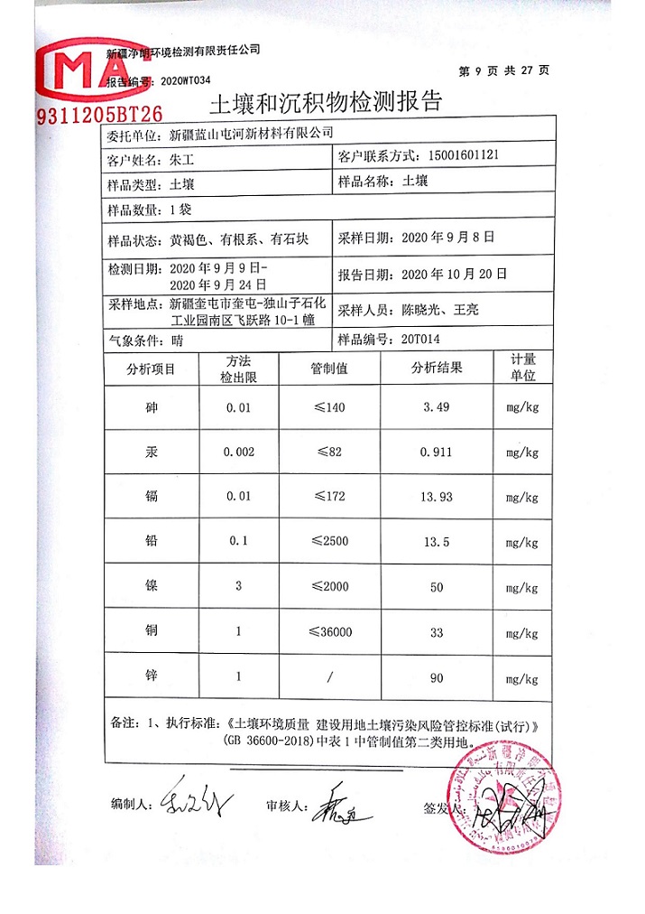 2020年9月8日,新疆净朗环境检测有限责任公司、新疆锡水金山环境科技有限公司在新材料公司内抽取土壤样本,进行检测,根据奎屯-独山子经济技术开发区环保局要求,现将新疆太阳成集团tyc122cc新材料有限公司2020年重点污染单位土壤检测情况公示如下: